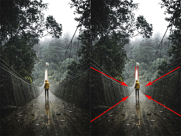 در این تصویر، چشم بیننده ابتدا فردی را که روی پل معلق ایستاده می‌بیند و سپس به انتهای پل که چراغی روشن است هدایت می‌شود. در اینجا خطوط راهنما صاف نیستند و حالت منحنی دارند.