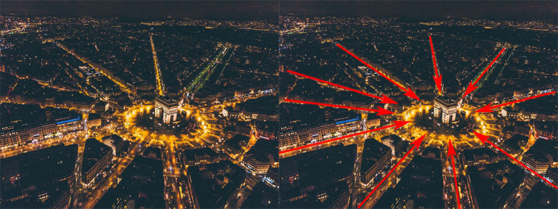در این عکس، چندین جاده که با چراغ‌های خیابانی مختلف روشن شده‌اند، خطوط راهنمای متفاوتی را تشکیل داده‌اند. تمام این خطوط به سمت یک سازه بزرگ شبیه به طاق اشاره می‌کنند و در نتیجه، طاق به مرکز توجه تصویر تبدیل می‌شود.