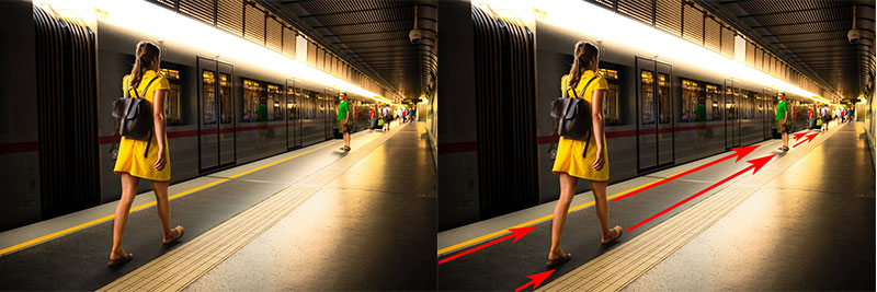 در این مثال، مسیر پیاده‌رو به‌عنوان خطوط راهنما عمل می‌کند که زن با لباس زرد، سپس فردی با لباس سبز و در نهایت گروهی از افراد در جلوی کادر را به هم متصل می‌کند.