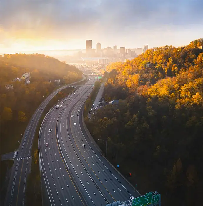 در این تصویر، خطوط ایجادشده توسط جاده نگاه بیننده را به سمت ساختمان انتهای مسیر هدایت می‌کند.